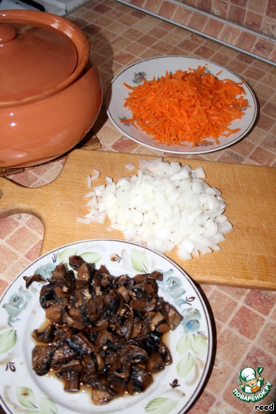 Пока наше тесто подходит, займемся приготовлением щей. Лук и грибы нарезать, морковь натереть на терке.