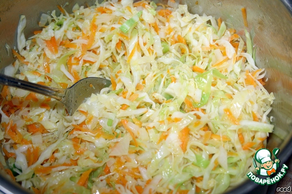 В сотейник налить подсолнечное масло, добавить лук и морковь, слегка обжарить и затем добавить нашинкованную капусту. Все перемешать и тушить под крышкой минут 5-10.