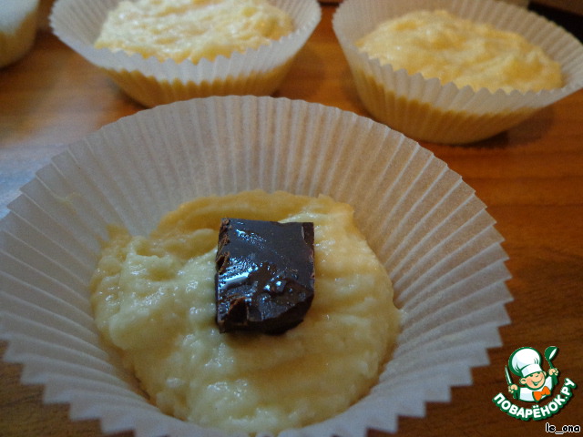 Выкладываем ложку теста в формочку, сверху - кусочек шоколада и закрываем сверху ещё ложкой теста. Отправляем в духовку при t 200 на 20 минут.