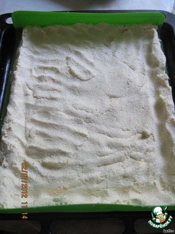 Творожную массу распределяем по хорошо смазанной форме или промасленной бумаге, а в идеале, по силиконовому коврику, в этом случае точно ничего не прилипнет! Формируем небольшой бортик. Пирог получается большим, на весь противень. Противень у меня 31 на 31 см.