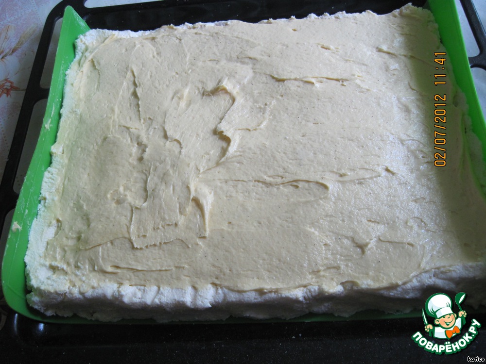 Выкладываем бисквитное тесто поверх творога, выравниваем поверхность.