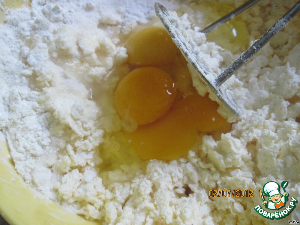 Творог тщательно перетереть с сахаром, добавить картофельный крахмал, яйца, хорошо перемешать.