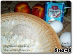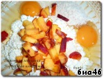 Теперь сверху посыпем разрыхлителем для теста, добавим яйца, персик помоем, вытрем, удалим косточку и нарежем на кусочки, ложкой перемешаем смесь