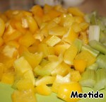Перец и сельдерей нарезаем небольшили кубиками-квадратиками,