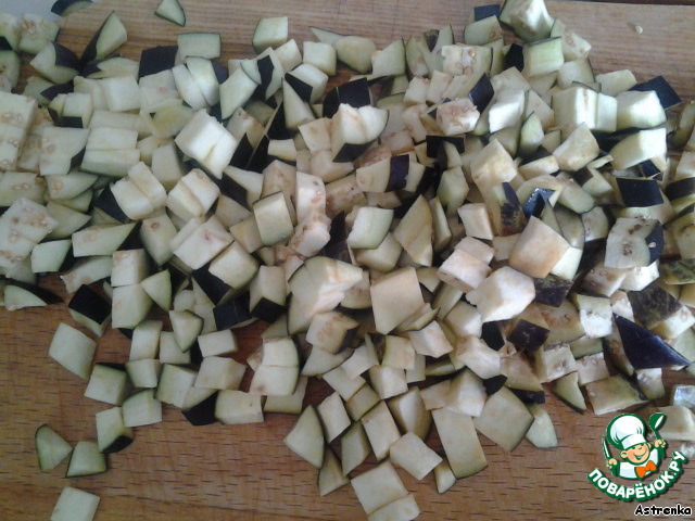 В это время занимаемся баклажанами: нарезаем их такими же небольшими кубиками.