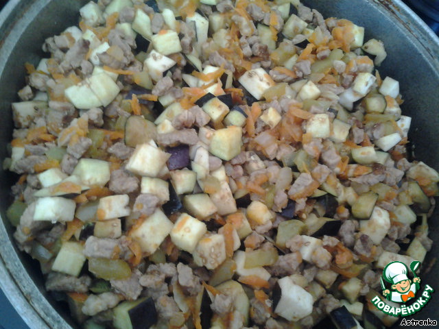 Добавляем их к мясу, томим и пропариваем, пока не дадут сок и не станут мягче.