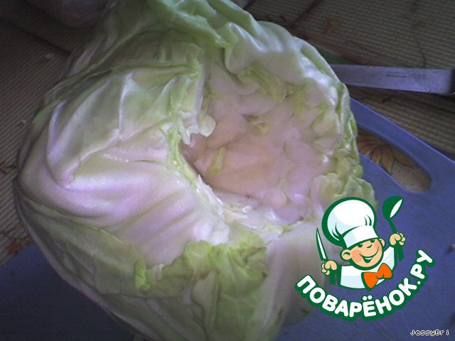 Рис промываем, заливаем кипятком и накрываем крышкой. У капусты вырезаем кочерыжку