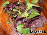 Базилик вымыть, отделить листики от стеблей, нарезать.