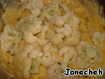 Отделить соцветия цветной капусты от стебля, нарезать не сильно мелко (иначе при варке и запекании соцветия просто расползутся).