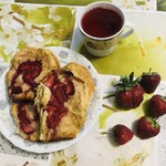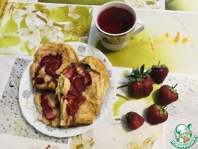 Руками каждый шарик немножко растянуть, по центру положить клубнику и присыпать 1 ч. л. сахара. Края с двух сторон хорошо защипать. Смазать пирожки яйцом и сразу выпекать 40 минут до появления золотистого цвета.