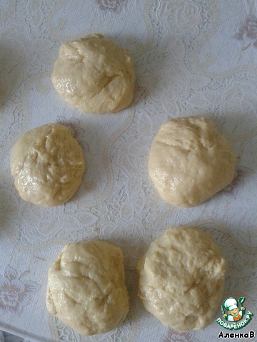 Духовку разогреть до 180 градусов, противень застелить пергаментной бумагой. Тесто переложить на смазанный растительным маслом стол, разделить его на 10 шариков.