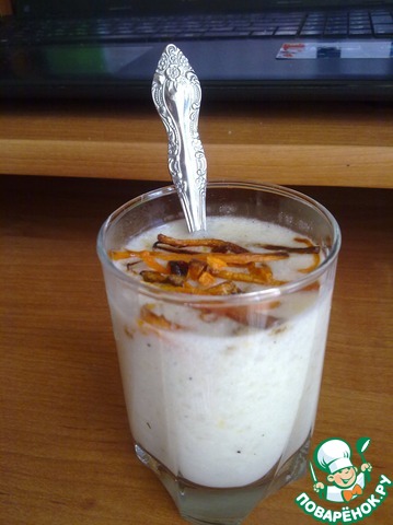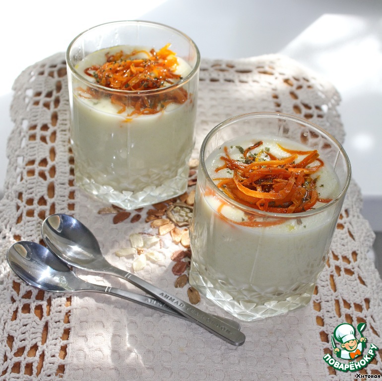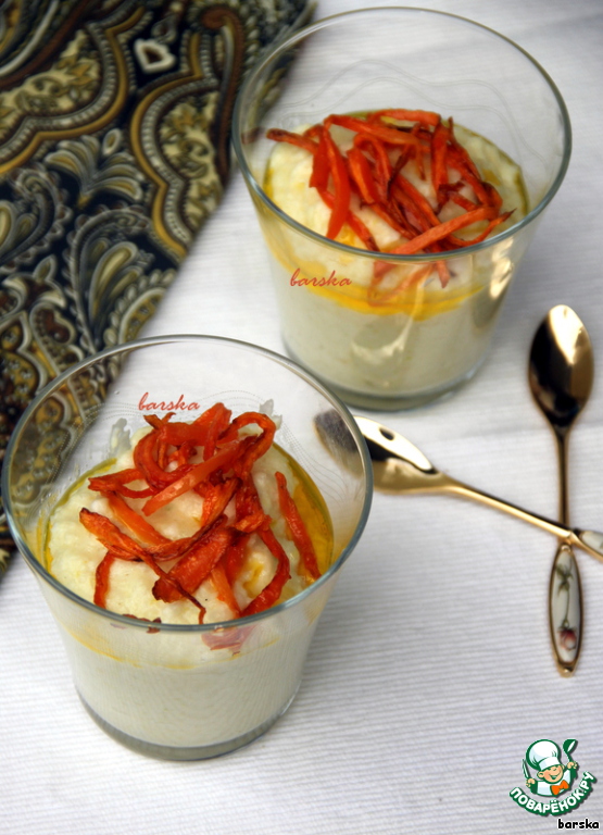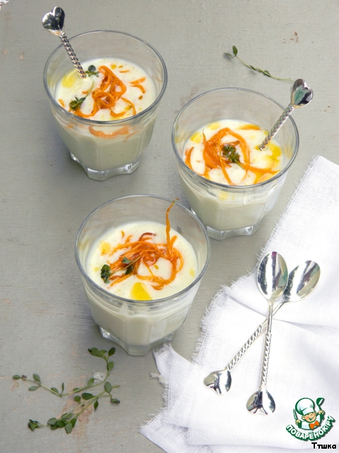 • Суп разлить по стаканам, добавить поджаренную морковь, капнуть несколько капель масла, в котором жарилась морковь.