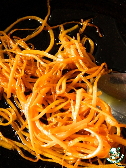 • Оливковое масло разогреть на сковороде и обжарить морковь до золотистого цвета.