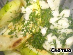 Кабачок очистить от кожицы, удалить семена, нарезать ломтиками и обжарить на растительном масле с двух сторон до готовности. Дать остыть.