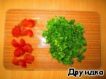 Тем временем нарезаем петрушку. Я для красоты еще добавлю в тарелочку бланшированные помидорки черри.