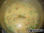 Куриное филе заливаем холодной водой, ставим на плиту и не забываем вовремя снять пенку. Через 3-4 минуты добавляем в кастрюлю шампиньоны и варим еще минуты 3-4. Затем в бой идут морковь, лук-порей и сельдерей, которые будут вариться еще минут 5. После этого добавляем сливки и лавровый лист. Оставляем эту чудную компанию на 5-7 минут.