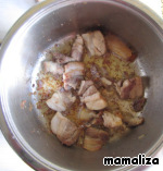 В кастрюле с толстым дном на растительном масле обжарим мелко нарезанную грудинку.