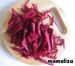 Свеклу нарежем тонкой соломкой и добавим к мясу. Обжариваем минут 15.
