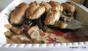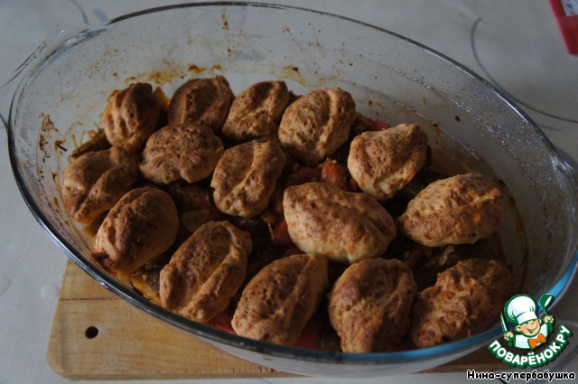 Большой ложкой отделять от теста крупные клецки и выкладывать их поверх овощей. Они не должны плотно прилегать друг к другу.