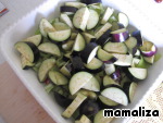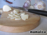 Когда овощи станут мягкими, достать форму из духовки. Чеснок нарезать пластинками.
