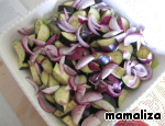 Лук очистить, нарезать соломкой. Добавить в начинку. Все сбрызнуть оливковым маслом и поставить в предварительно нагретую до 190 градусов духовку на 15 минут.
