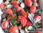 Помидор нарезать ломтиками, добавить к овощам вместе с чесноком и листиками базилика.