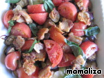 Бекон нарезать и зажарить до хрупкости. Жир слить и остудить. Ломтики бекона покрошить и добавить в овощи. Все перемешать и поставить в духовку еще минут на 10.