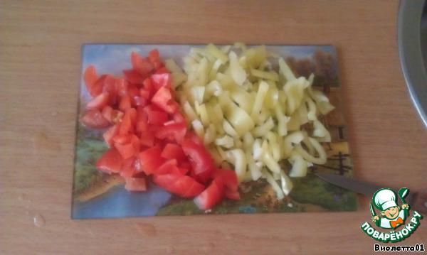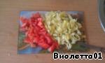Берем помидоры, режем их не совсем мелко, средненько, я кожицу не снимала, но, вообще, кому как нравятся, но желательно снимать. Берем перец, верхние корешки (попки) срезаем, вынимаем семена, промываем их и начинаем нарезать не совсем мелко, но и не крупно, так же, как и помидоры, средне нарезаем. Далее берём острый свежий красный или зеленый перец, нарезаем его мелко, я мало нарезала, так как слишком острый он, а так, на любителя - кто как любит.