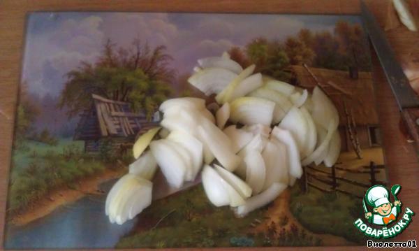Пока у нас все тушится, мы берём лук крупный, режем его на две части, каждую часть опять режем на две и начинаем нарезать полукольцами не толсто.