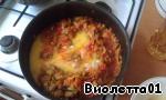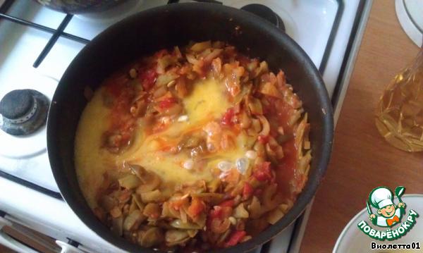 Через 20-25 минут снимаем пробу, должно быть все потушено и готово. Мы берем и заливаем все яйцом и начинаем всё перемешивать, чтобы яйцо "схватилось" с нашими овощами. Я на несколько минут после перемешивания накрывала крышкой.