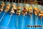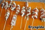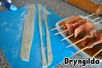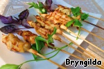 Рыбу залить соевым соусом, нарезать и нанизать на шпажки.