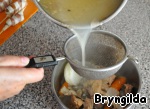 Поставить бульон варить. Добавить лавровый лист, перец горошком и соль.