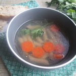 Бульон готов. Пробуем на соль, процеживаем. Лук и корень - выбрасываем. Курицу вытаскиваем и откладываем для других блюд. Морковку натираем на тёрке или нарезаем фигурно, и возвращаем в бульон обратно. Добавляем зелень. Мы с вами сварили лёгкий и полезный прозрачный бульон.