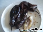 Баклажаны целиком запечь в духовке при температуре 220 градусов в течении 25-30 минут. Затем дать остыть и очистить от шкурки, но не удаляя черенок.