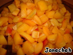 • Выложить фрукты в кастрюлю для приготовления джема. Добавить сок лимона и ванильный сахар, обыкновенный сахар, все перемешать.