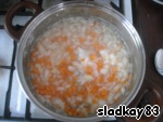 Добавьте к рыбе промытый рис, нарезанные морковь и лук и варить еще 10-15 минут (в зависимости от риса, время может увеличиться).