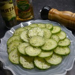 В последнее время я влюбилась в этот салат. Лeгкий, простой, свежий, элегантный, изящный до изысканности и вкусный до безобразия! В салате ничего нет кроме огурцов. Всe дело в заправке. Она решает всe! Рецепт из столь модной сейчас средиземноморской кухни.