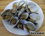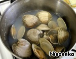 В кипящую воду положить моллюски, закрыть крышкой и варить до тех пор, пока ракушки не раскроются. Около 10 минут. Те ракушки, которые не раскроются, надо выбросить.