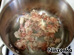 В кастрюлю налить 1 ст. ложку растительного масла и добавить нарезанный на кусочки (примерно 1см) бекон. Готовить, периодически помешивая, до золотистого цвета. Около 7 минут.