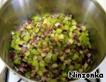 В кастрюлю, где остался жир от бекона, добавить еще 1 ст. ложку растительного масла, положить мелко нарезанный лук, сельдерей и чеснок. Готовить на среднем огне около 7 минут. Овощи должны стать слегка золотистыми.