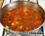 Затем добавить к овощам мелко нарезанные помидоры, томатный сок, бульон от моллюсков и нарезанную на небольшие кубики картошку. Варить на сильном огне до готовности картошки. Около 8-10 минут.
