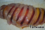 В каждый надрез вложить по дольке персика и сбрызнуть растительным маслом.