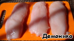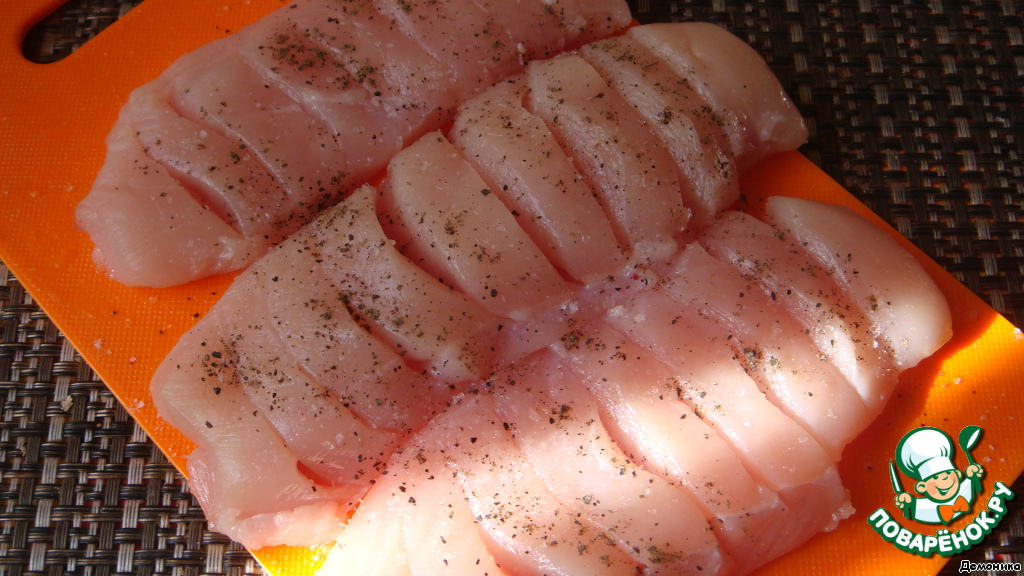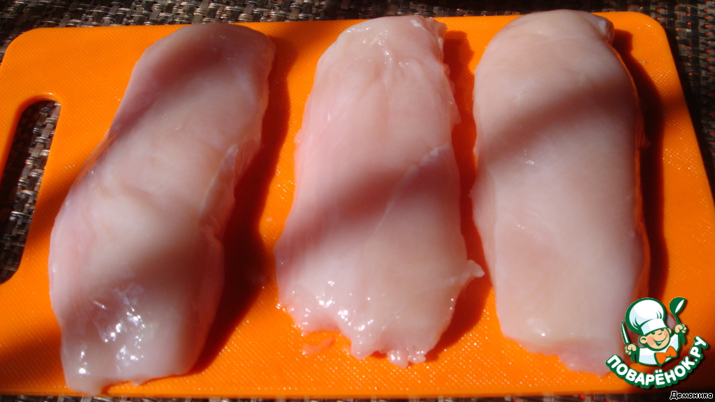 Куриное филе вымыть и обсушить. Слегка обрезать края, постаравшись придать кусочкам форму прямоугольника. -