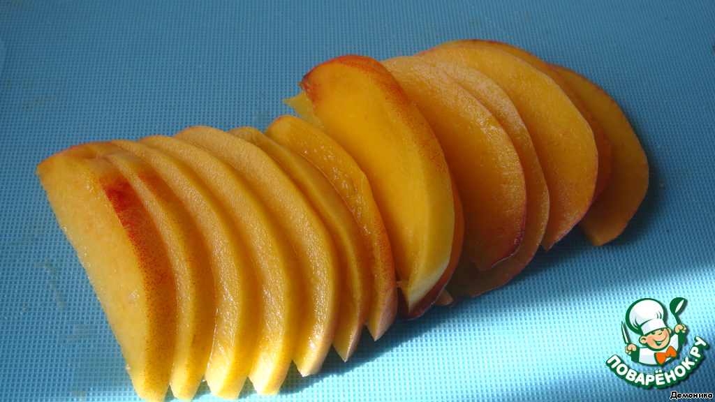 Персик разрезать пополам, вытащить косточку и нарезать нетолстыми ломтиками.