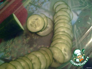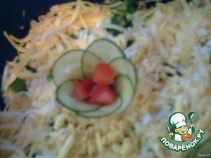 выложить розочки из кружочков оругчика, серединку присыпать кусочками помидорки.