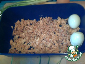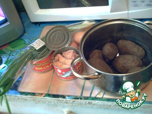 Картофель отварить в "мундире" и почистить, яйца отварить и почистить, зеленый лук промыть и порезать, открыть горбушу и прямо в банке её измельчить.