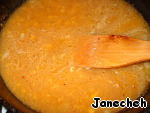Затем положите абрикосовое пюре в сковороду с куриным бульоном и луком.