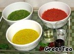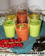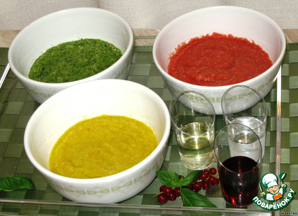 Пюрировать ингредиенты. Пюре из помидор и красной смородины отфильтровать через ситечко (не очень мелкое). В каждый состав добавить хлебный мякиш и заправить по вкусу лимонным соком, солью и по желанию алкогольным напитком. Для варианта с помидорами подходит водка, для желтого перца - вино марсала (сухое), огурцы прекрасно дополняет сухой вермут. Думаю, излишне говорить что количество алкоголя должно быть минимальным, так как служит для обогащения вкуса. Так же можно приготовить и без его добавления. Это лишь один из вариантов.