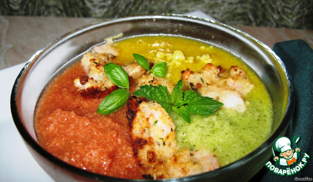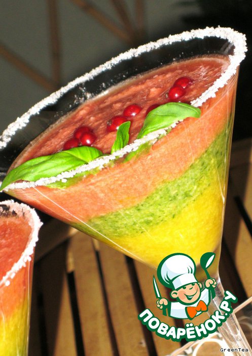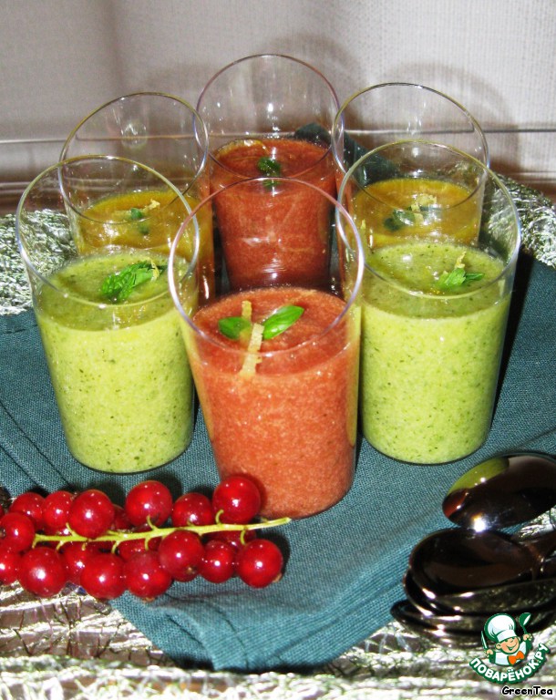 Суп коктейль, суп аперитив, суп закуска... Свежие овощи в сочетании с небольшим количеством алкоголя или без. За основу каждый может взять свой любимый вариант гаспачо, сальморехо или других супов-пюре. Для всех трех версий я использую мой "фантазийный" набор ингредиентов, опробованный годами. Яркие краски и яркий вкус.