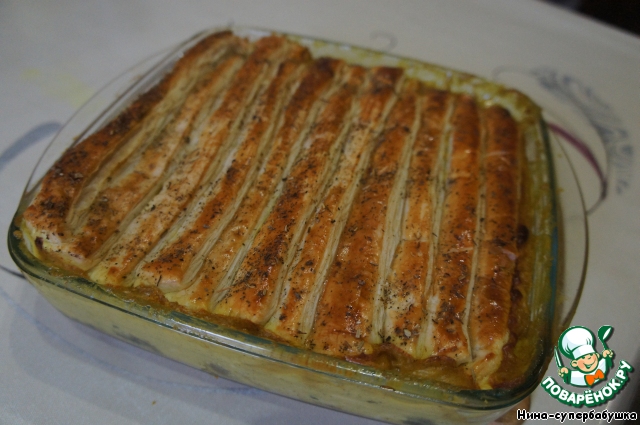 Рецепт «Пирог из слоeного теста с курицей в сливочном соусе»: